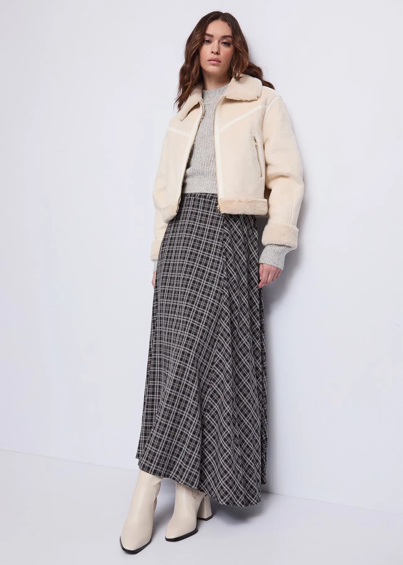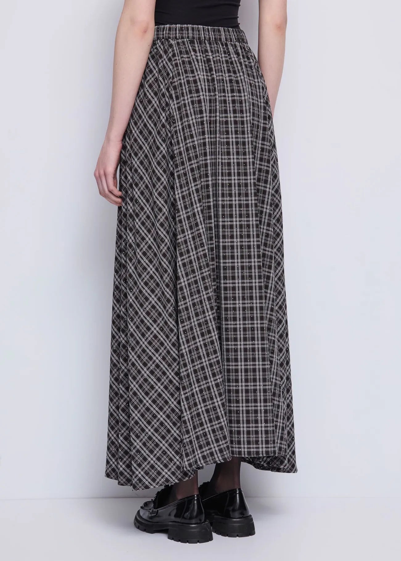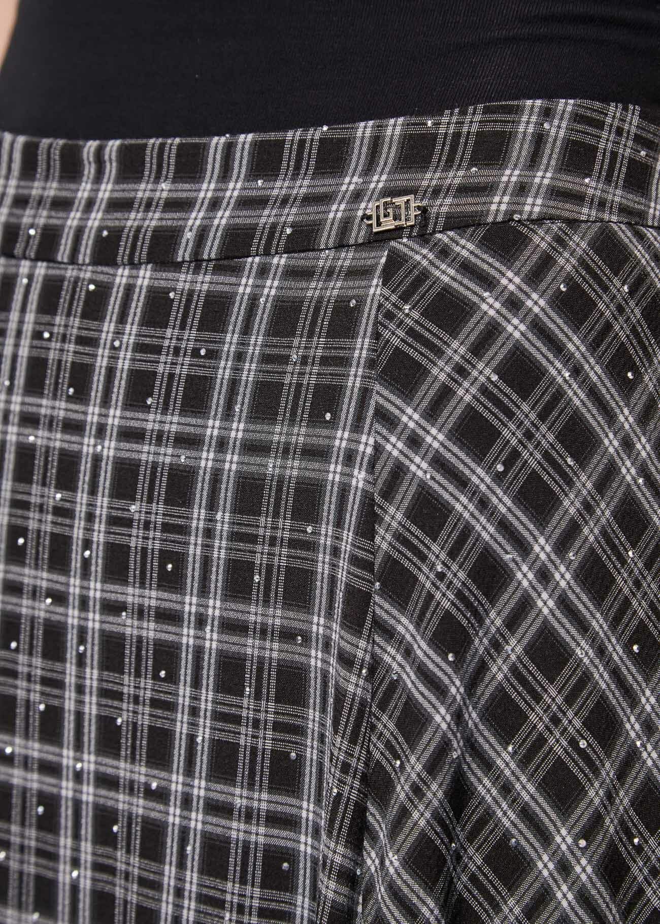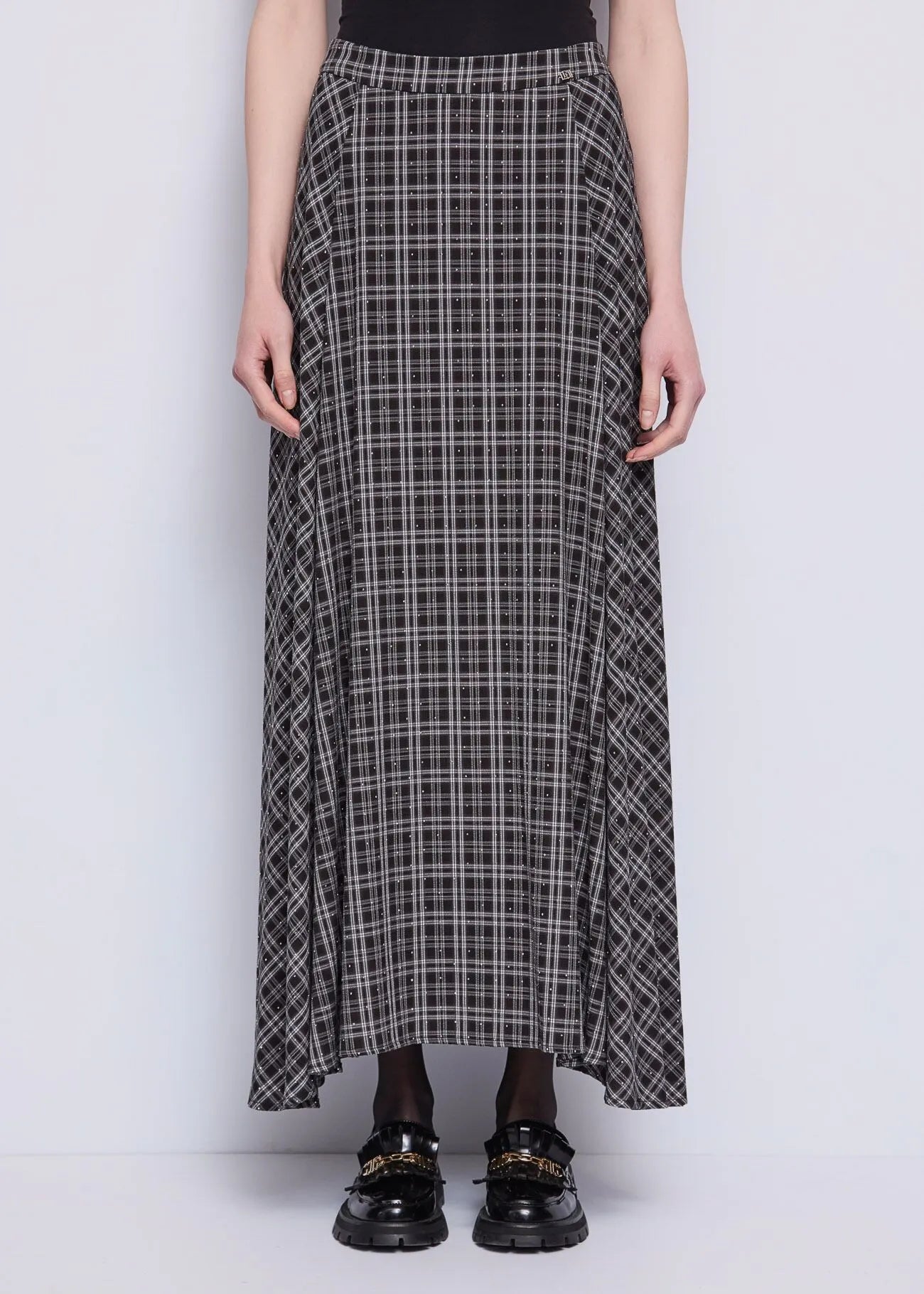Scegli la gonna lunga in viscosa elasticizzata con motivo check, strass all over e logo GJ in metallo. Perfetta per look versatili dal tocco glamour.