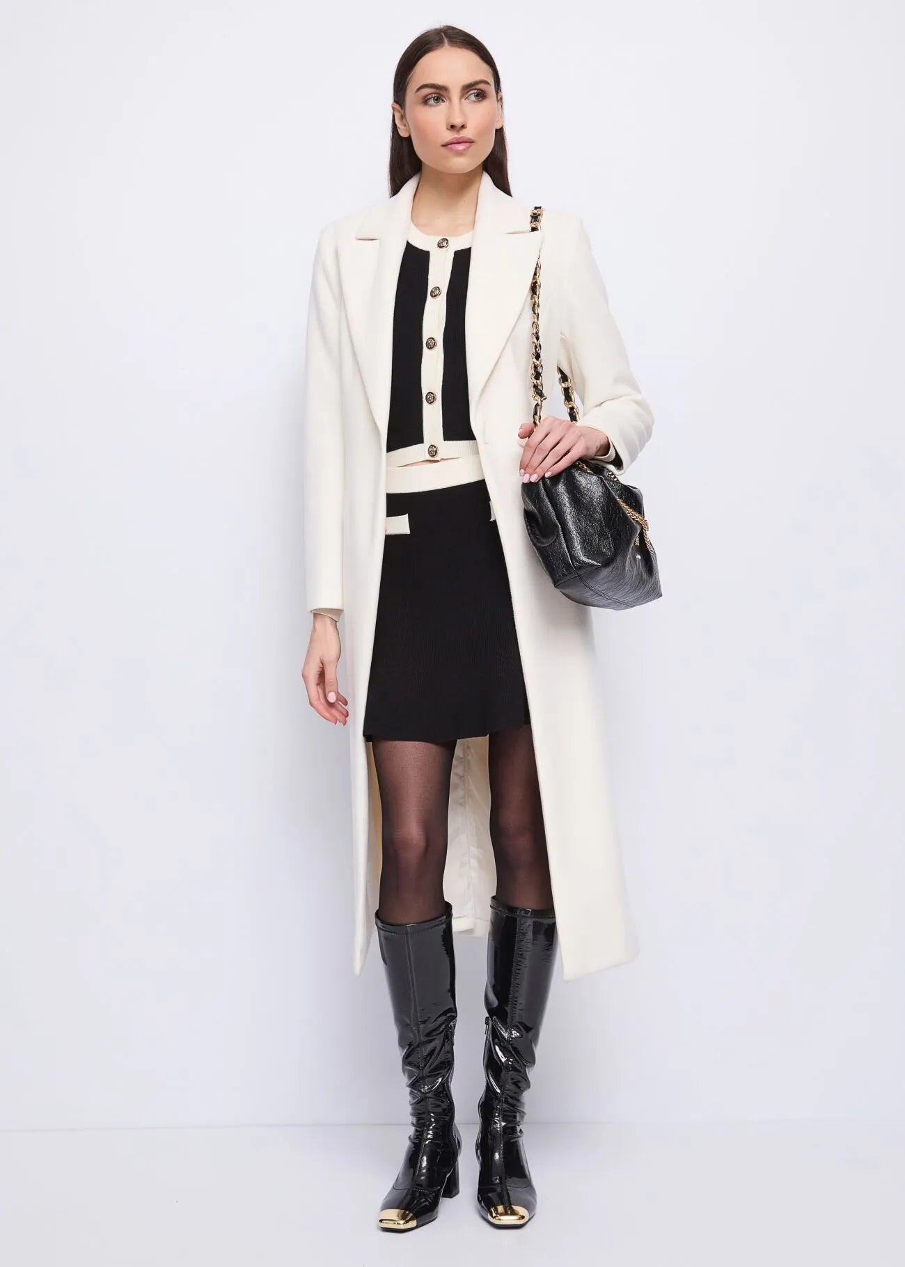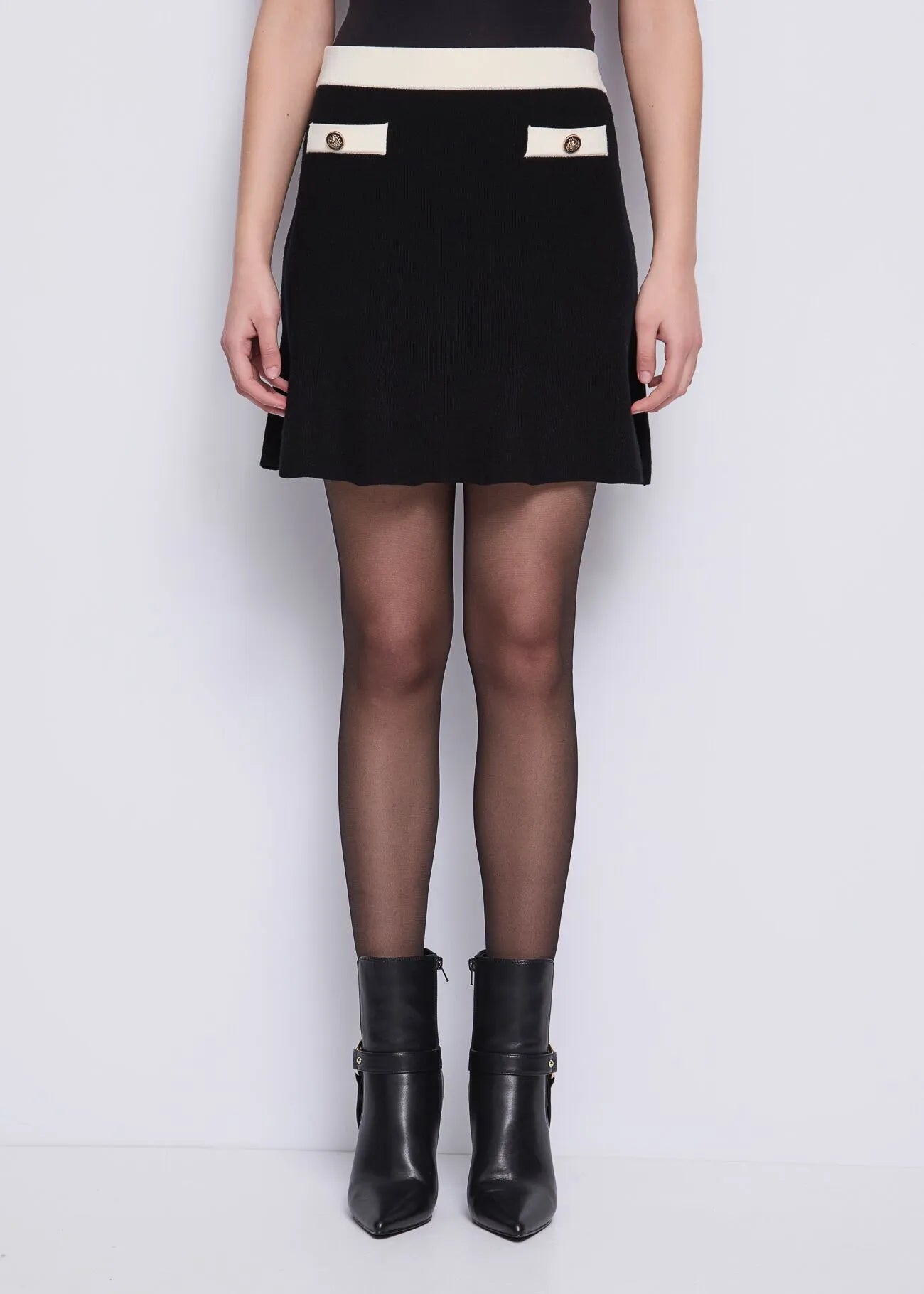Scegli la minigonna in maglia di misto viscosa con dettagli a contrasto e bottoni gioiello. Per un look chic moderno e seducente.
