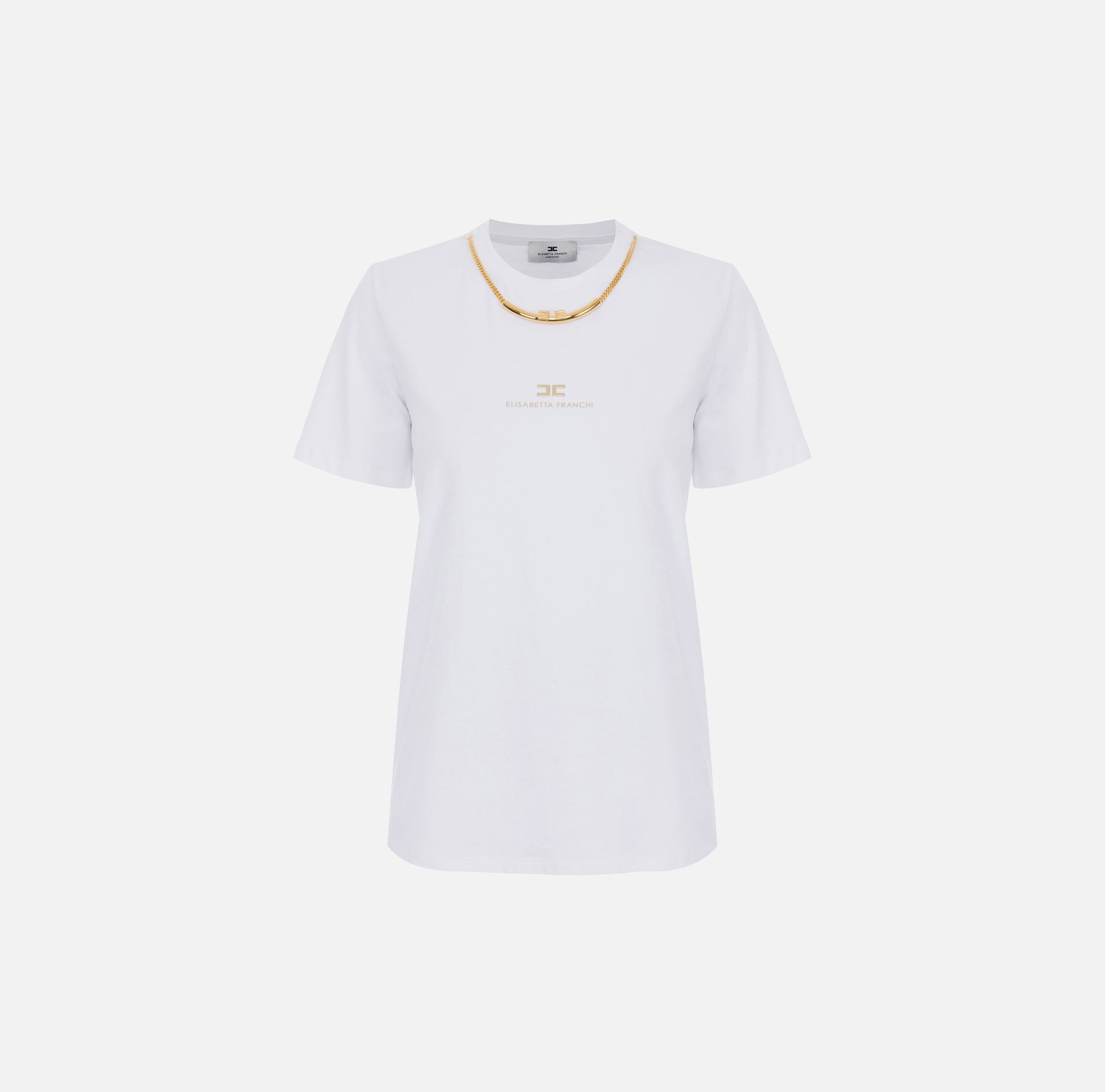 Maglietta a maniche corte in jersey di cotone. È impreziosita dalla collana amovibile con catena, logo centrale ed elementi tubolari in metallo dorato. Il logo a rilievo regala un'ultima nota di luce. Vestibilità regular.