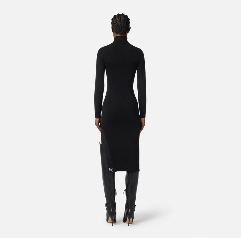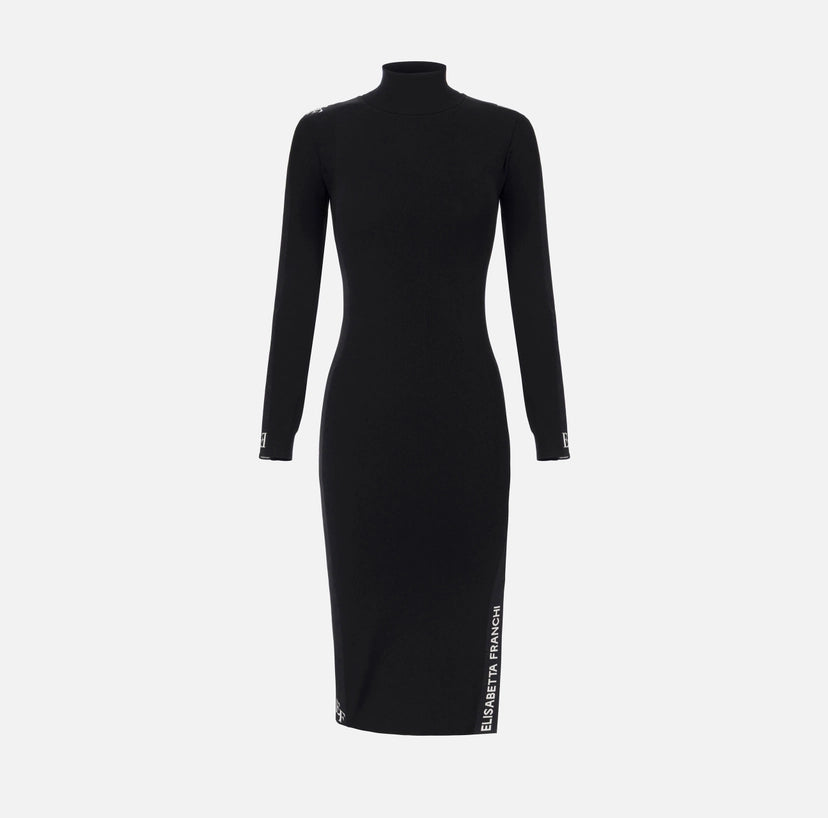 Abito a tubino in maglia dalla vestibilità aderente. Il vestito ha collo alto, maniche lunghe e si distingue per lo spacco laterale sormontato dalla banda in viscosa lucida. I dettagli logo resi da intarsi e colori a contrasto elevano il design essenziale del capo con una nota grafica.