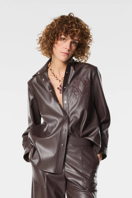 Camicia over in ecopelle caratterizzata da un ricamo sul petto, con un design moderno e deciso. La linea ampia e la struttura morbida garantiscono un comfort rilassato. Il ricamo dona un dettaglio elegante, ideale per outfit urban chic che combinano forza e femminilità con equilibrio.