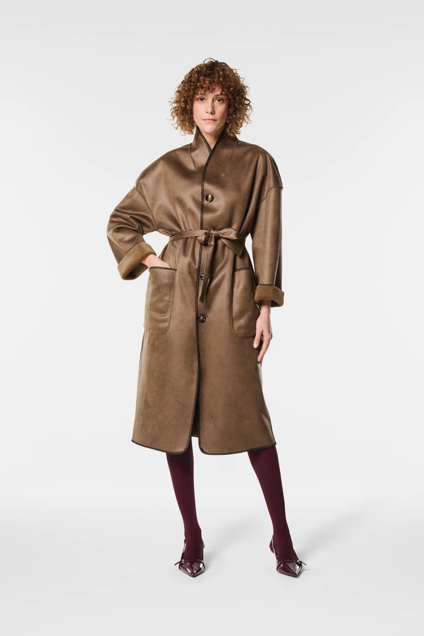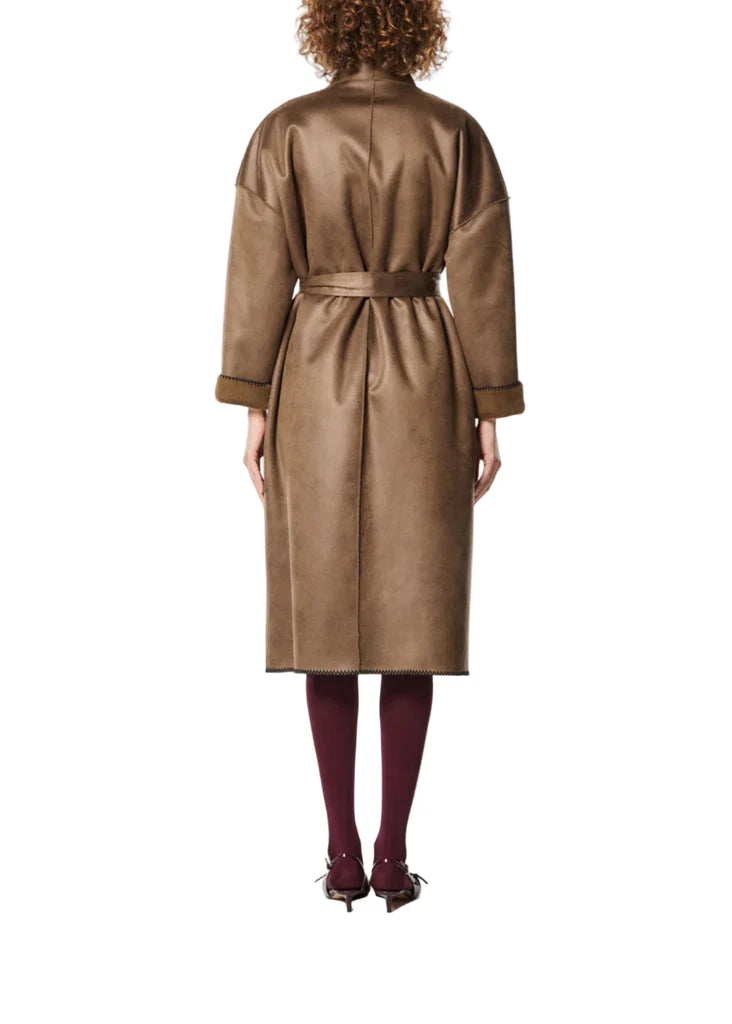 Elegante cappotto reversibile in ecovisone con cintura, ideale per chi ama unire comfort e femminilità. Morbido e avvolgente, sottolinea la vita con un tocco sofisticato. Perfetto da indossare per un outfit sofisticato con un tocco contemporaneo.