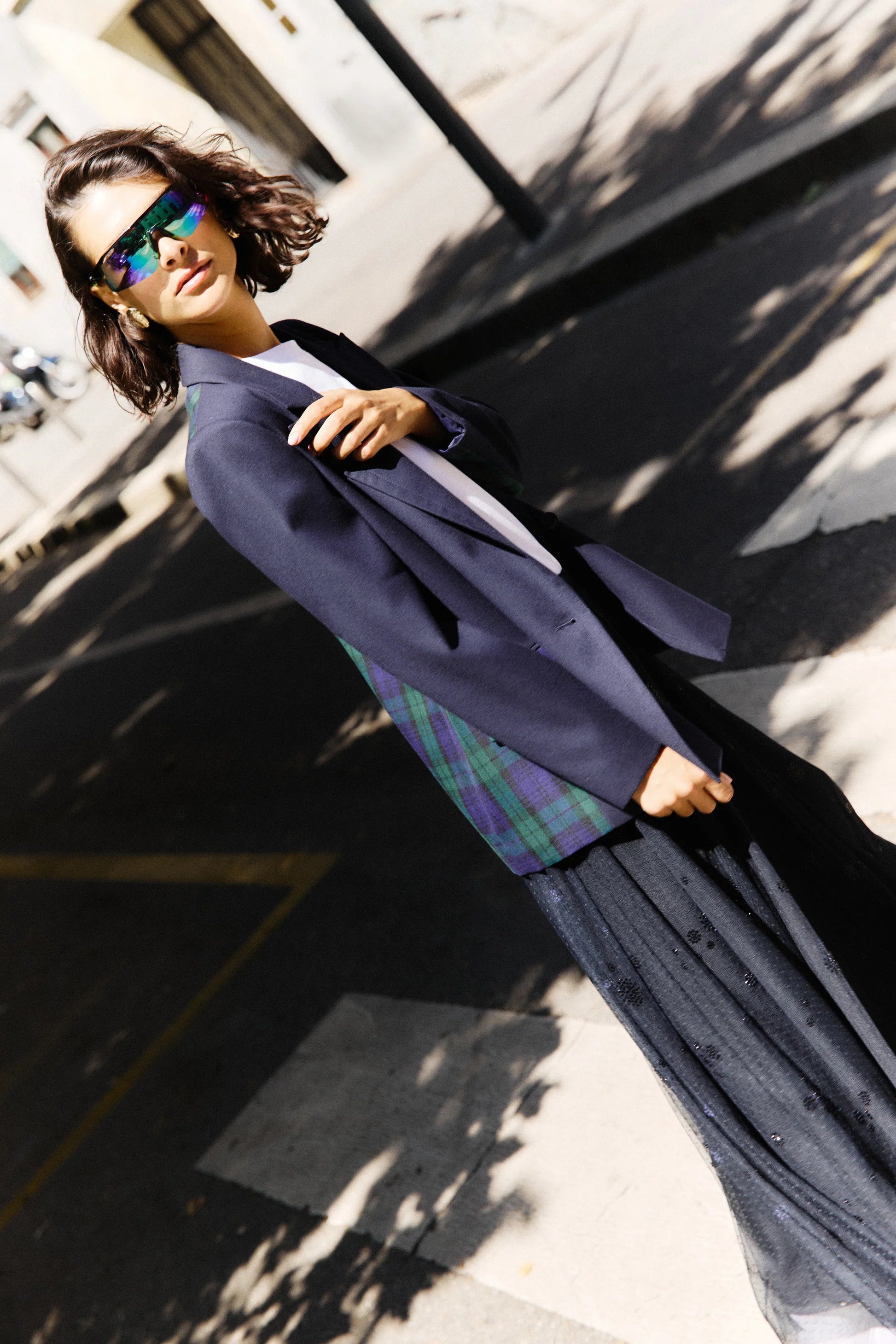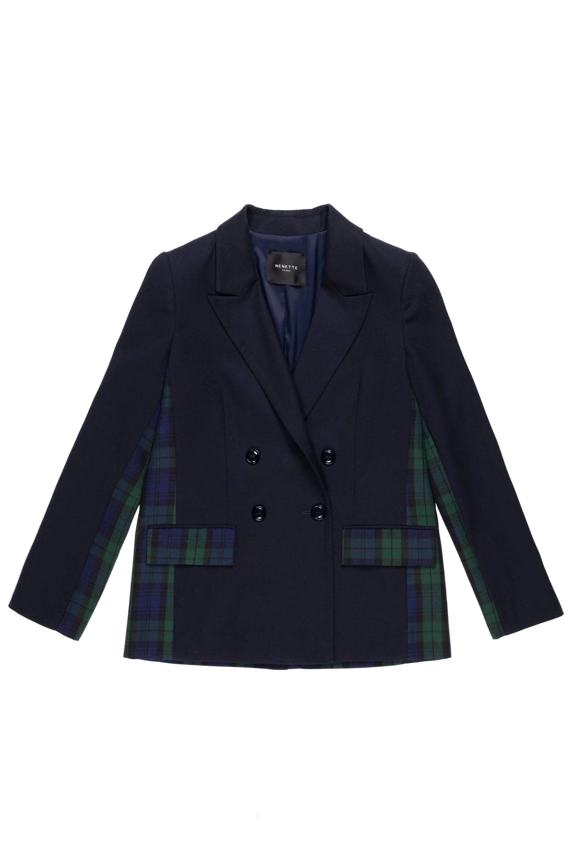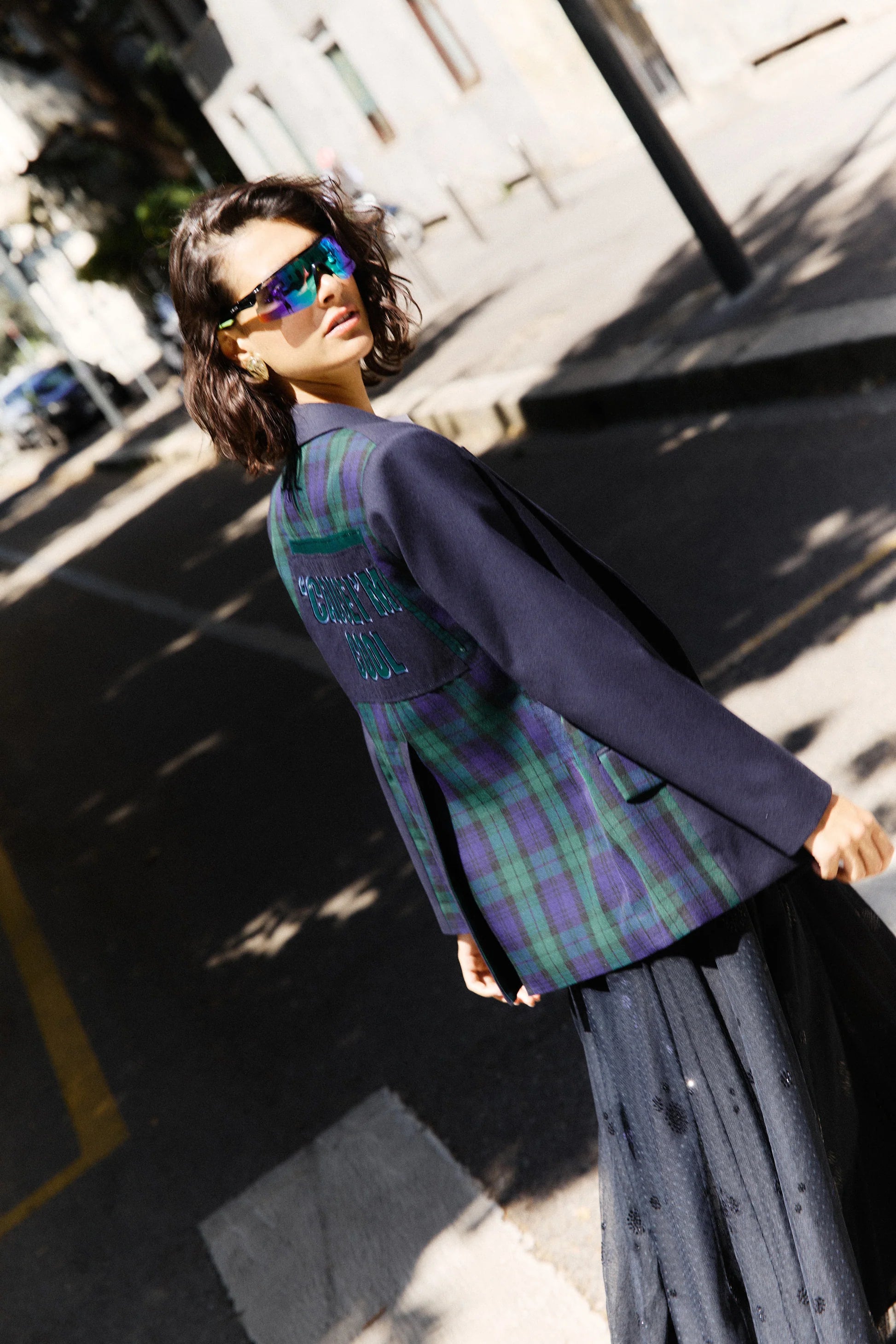 Giacca doppiopetto con pannello anteriore in fresco lana e retro in tartan, arricchita da un ricamo sulla schiena. Un mix audace e raffinato che unisce eleganza classica e dettagli contemporanei. Perfetta per chi cerca un capo distintivo, con carattere e cura sartoriale.