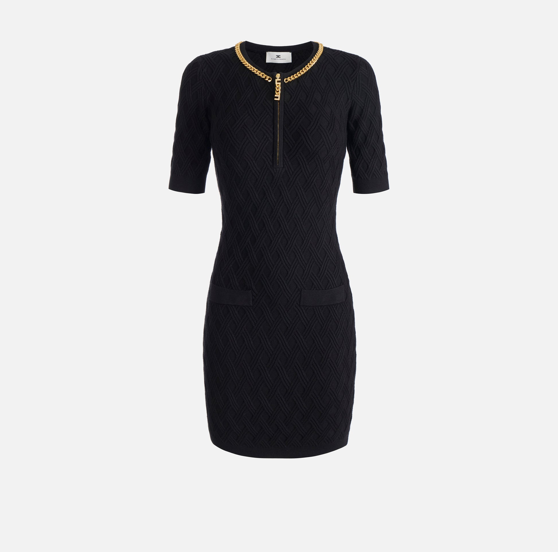 Mini abito in maglia dalla vestibilità aderente. Il vestito ha girocollo, maniche sopra al gomito e si distingue per l'elaborata lavorazione 3D che crea un disegno geometrico a rombi su tutta la lunghezza. Impreziosito dalla catena groumette, ha scollo con zip e tirazip gioiello con logo.