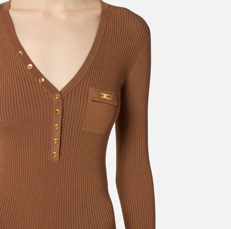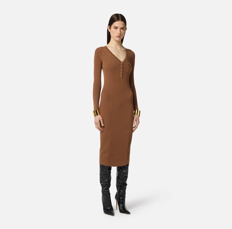 Abito a tubino in maglia dalla vestibilità aderente. Il vestito ha scollo a V con bottoni, maniche lunghe, gonna longuette. Si distingue per l'elaborata lavorazione a costine che crea un mix di definizione e morbidezza. Il taschino in raso con logo in metallo dorato completa il capo.