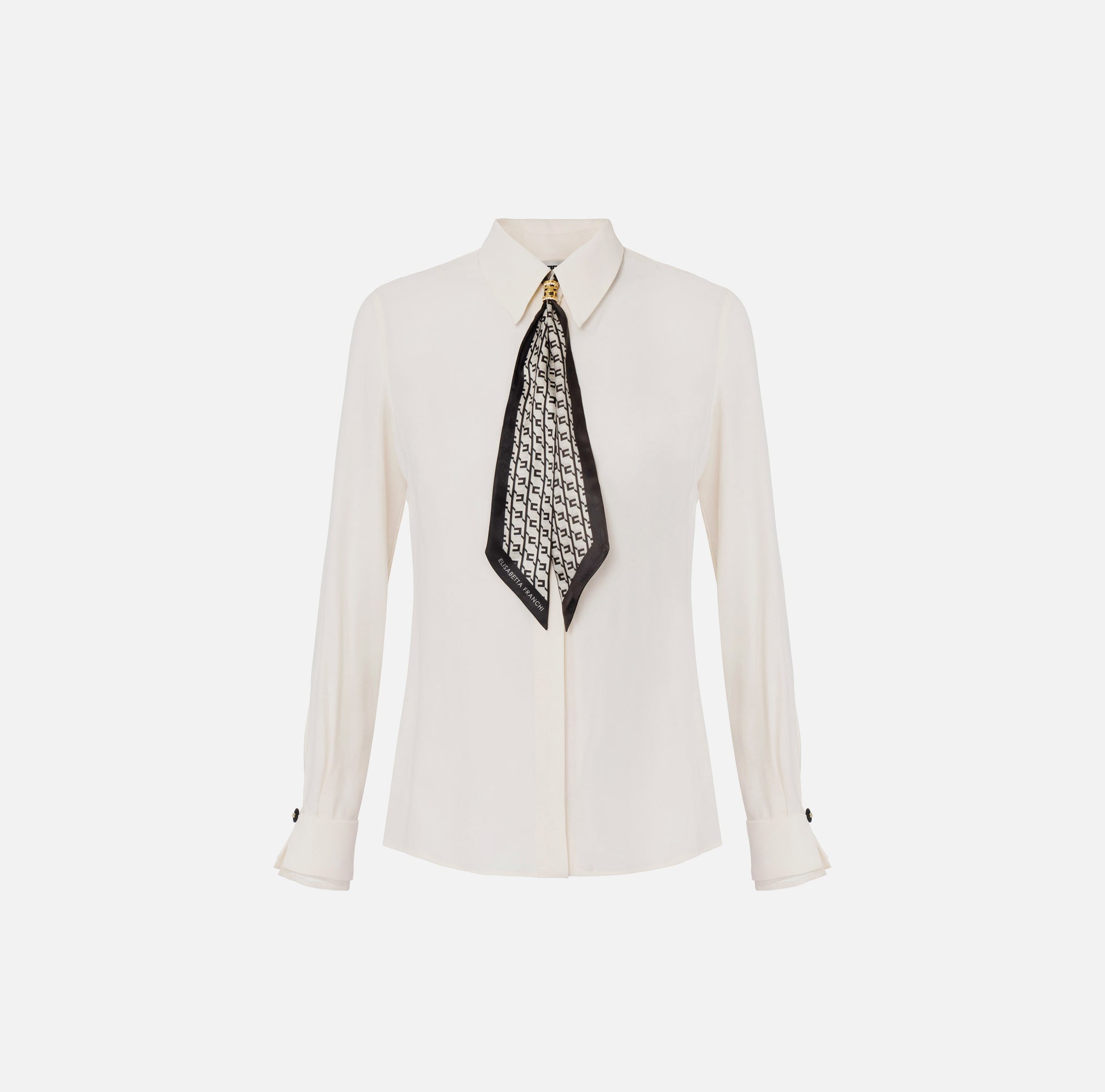 Camicia in georgette dalla vestibilità slim. Il colletto è arricchito dal foulard con stampa geometrica, trattenuto dal passante gioiello con logo. I polsi hanno bottoncino a contrasto e doppio strato in organza che crea raffinate trasparenze.