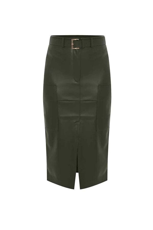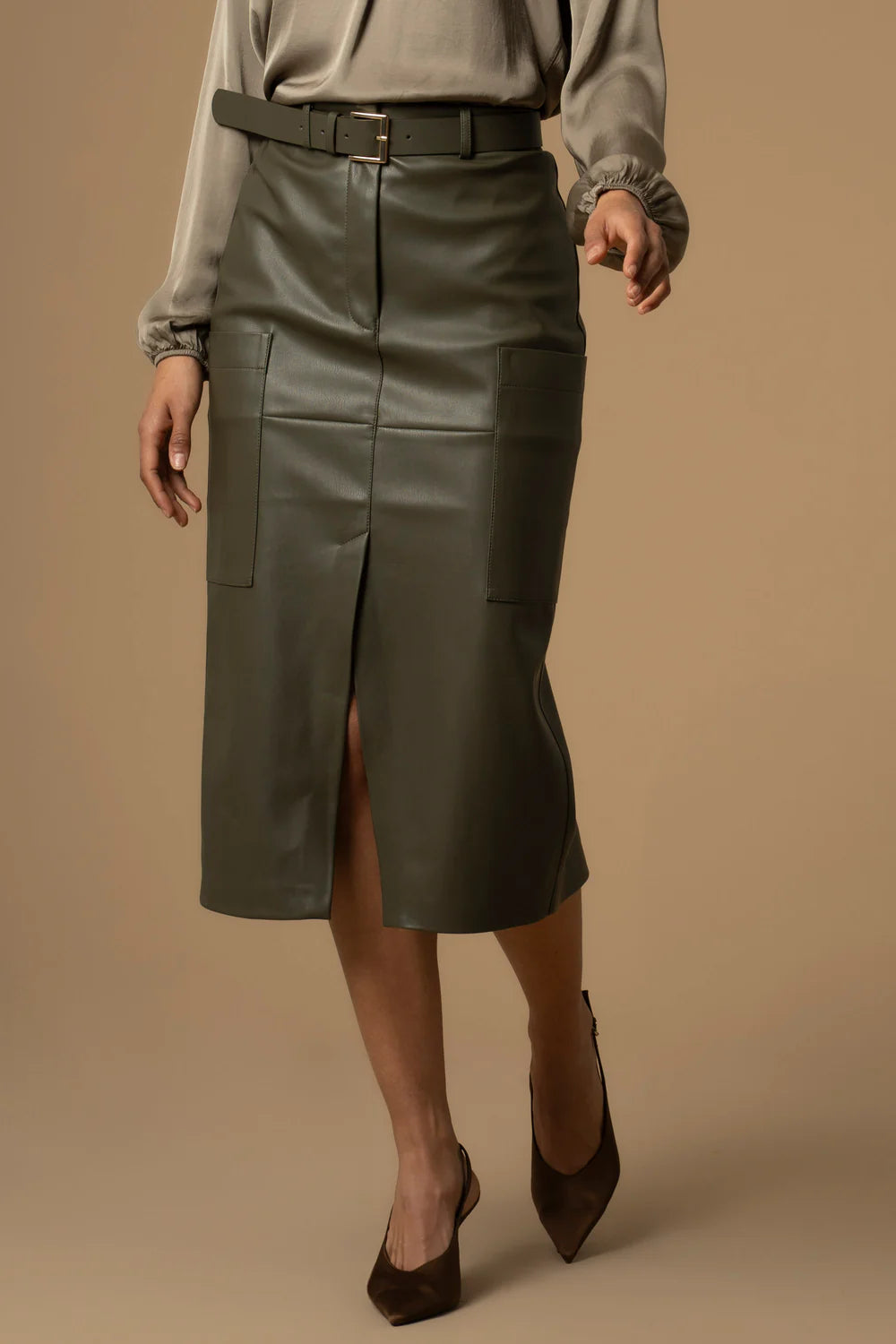 Il tessuto in ecopelle regala a questa a questo gonna longuette grinta e carattere. Elegante e versatile, presenta uno spacco e ampie tasche sul davanti, chiusura con zip e cintura in vita.