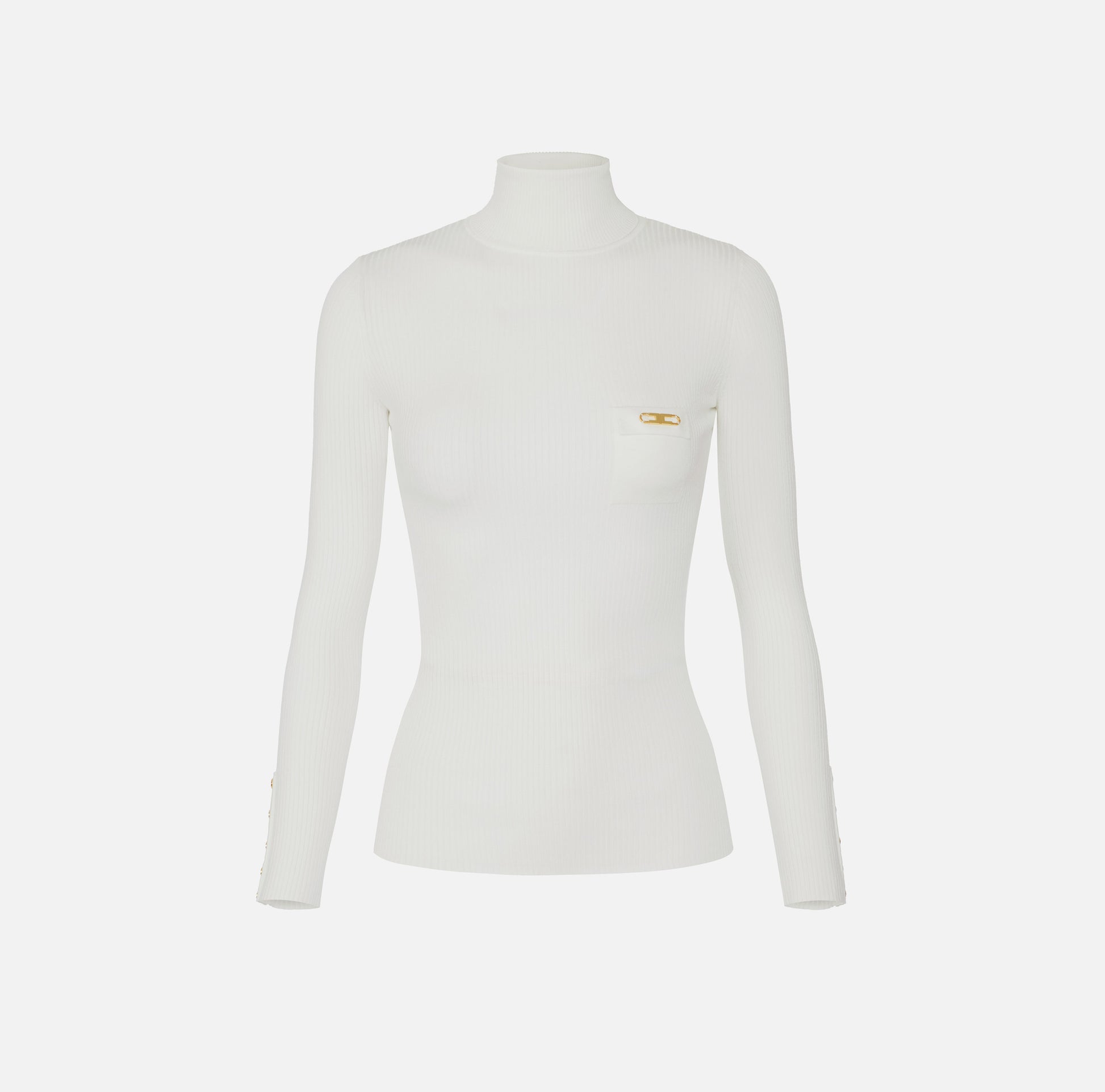 Maglia a costine dalla vestibilità aderente. Con collo dolcevita e maniche con bottoni al fondo, è personalizzata dal taschino in raso con dettaglio logo che regala una nota di luce.