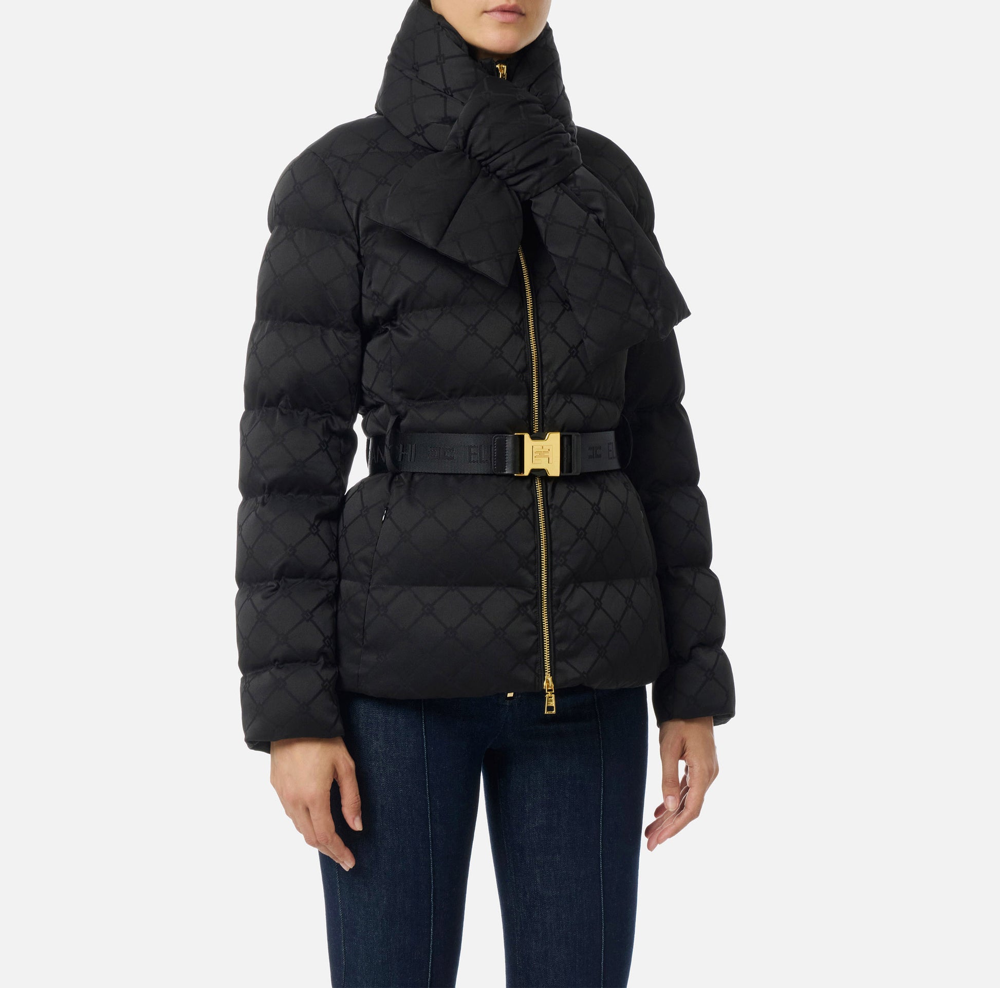 Piumino in tessuto vela dalla vestibilità regular. Presenta collo con sciarpa imbottita e amovibile e tasche con zip invisibile. Il pattern all-over con losanga jacquard rende la texture preziosa. Cintura in vita con fibbia per definire il punto vita.